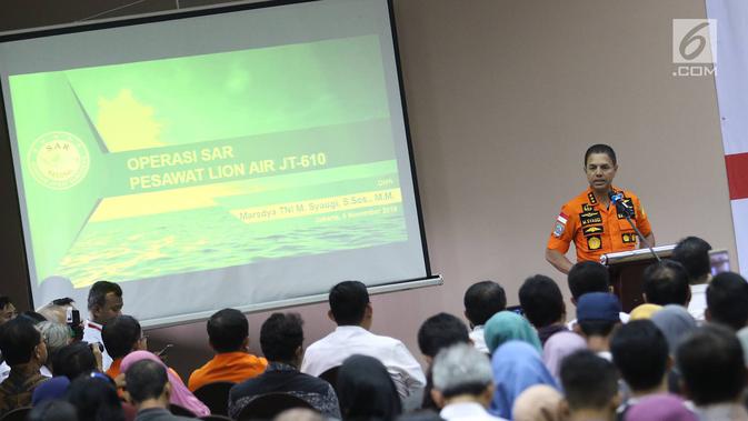 (Dari kiri) Ketua KNKT Soerjanto Tjahjono, Menhub Budi Karya, Ketua Basarnas Marsekal Madya M. Syaugi, Kapusdokkes Polri Brigjen Arthur Tampi saat evaluasi proses evakuasi Lion Air JT 610 di Jakarta, Senin (5/11). (Liputan6.com/Immanuel Antonius)
