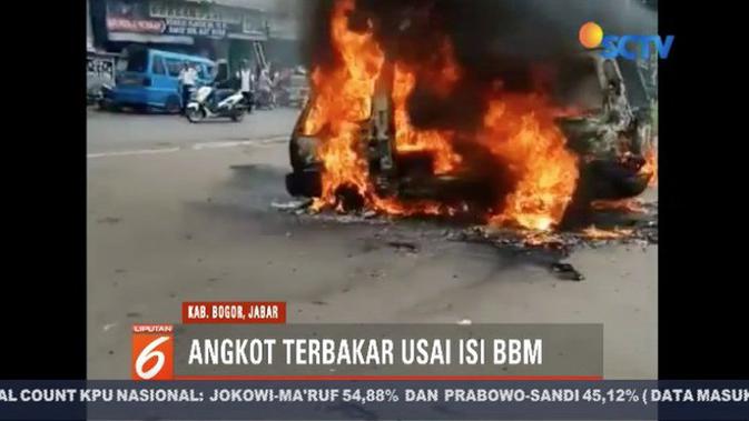 Liputan6SCTV, Bogor - Sebuah angkot jurusan Leuwiliang-Bogor, ludes terbakar usai mengisi bahan bakar di SPBU Leuwiliang, Kabupaten Bogor, Jawa Barat. Kebakaran diduga akibat konsleting listrik pada bagian kabel mobil.