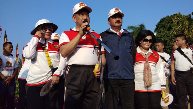 Liputan6.com, Jakarta - TNI dan Polri menggelar olahraga bersama di Silang Monas Jakarta Pusat, Minggu (7/6/2019). Kegiatan ini digelar dalam rangka merayakan hari Bhayangkara ke-73.