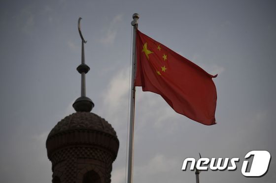 | 신장위구르차지구에 걸린 중국 오성홍기 뒤로 이슬람 사원이 보인다. © AFP=뉴스1 |
